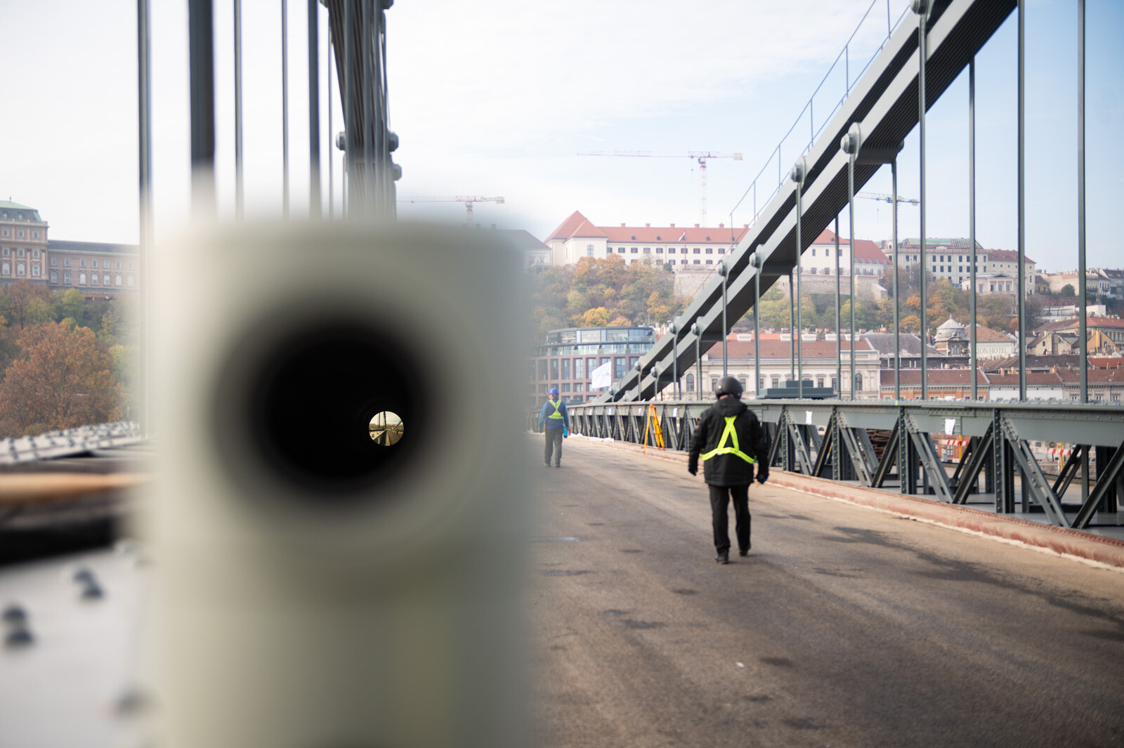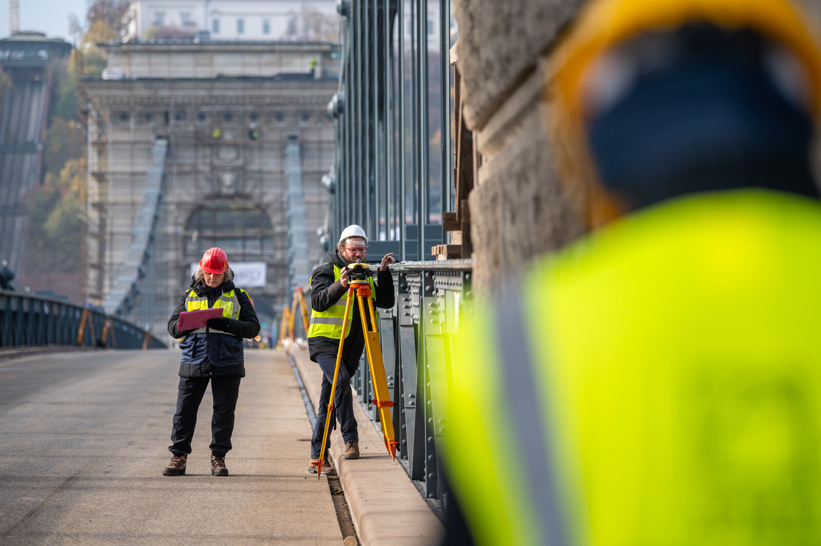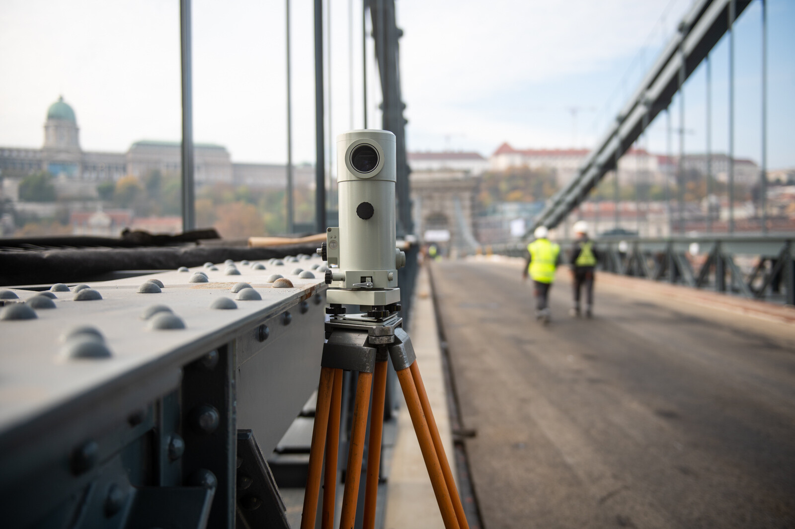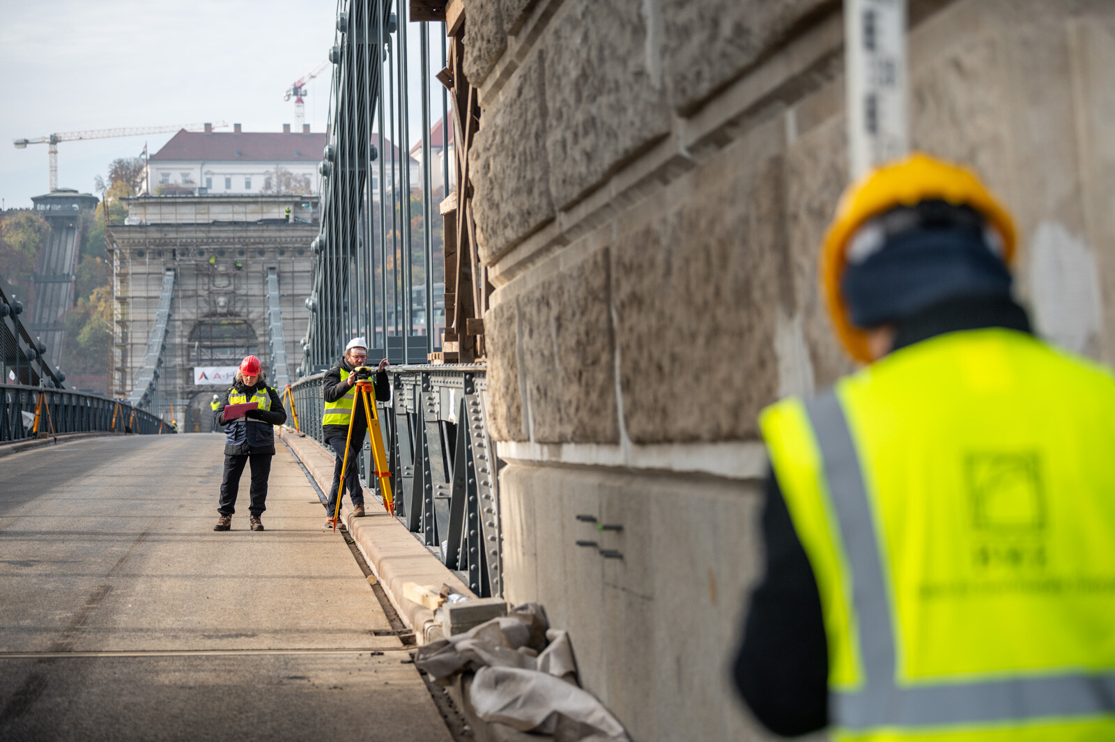Eközben a hídról és a Duna-partról 0,5 milliméter pontosságú geodéziai műszerrel mérték a híd lehajlását. A lánckötegeken, a függesztőrudakon, a bentmaradó, régi hídszerkezeten, illetve az új acélpályán elhelyezett nyúlásmérő bélyegek segítségével azt figyelték, milyen alakváltozások jelennek meg a szerkezetben, és milyen feszültségek keletkeznek az egyes elemekben. A budai pillér tetején lévő koronasaru-teremben a koronasaru elmozdulását is monitorozták.