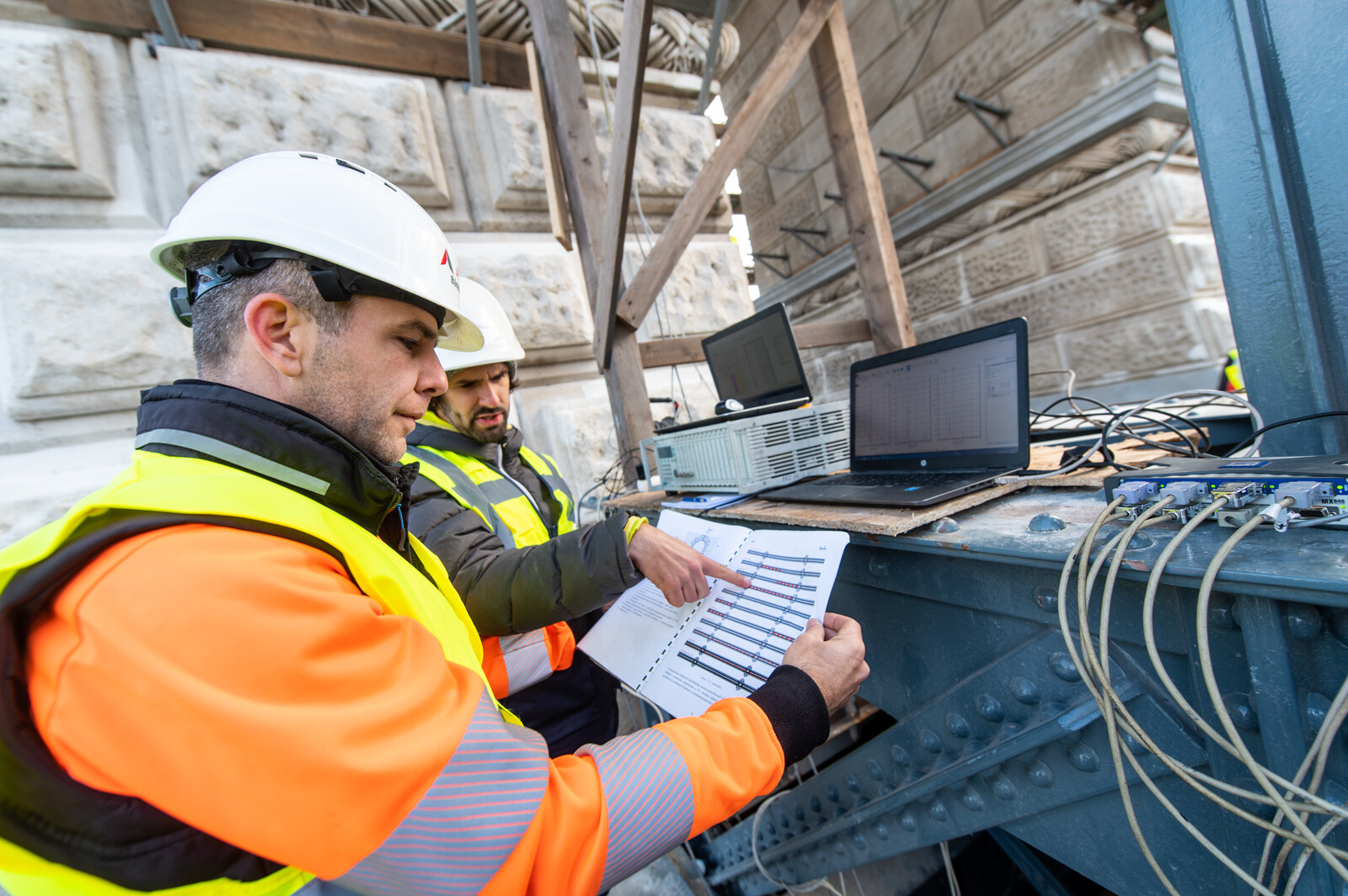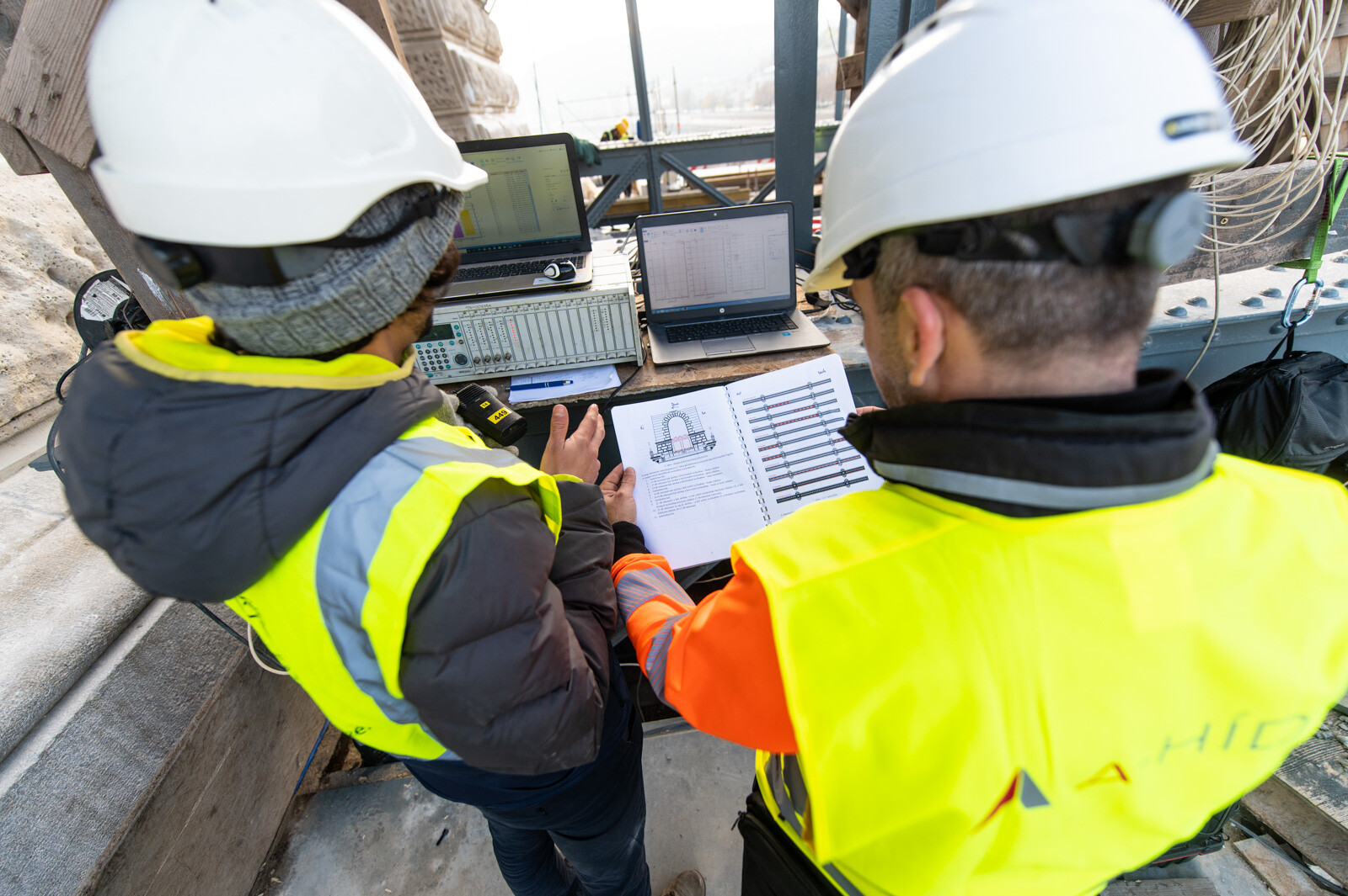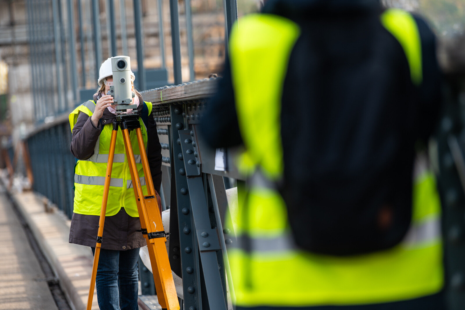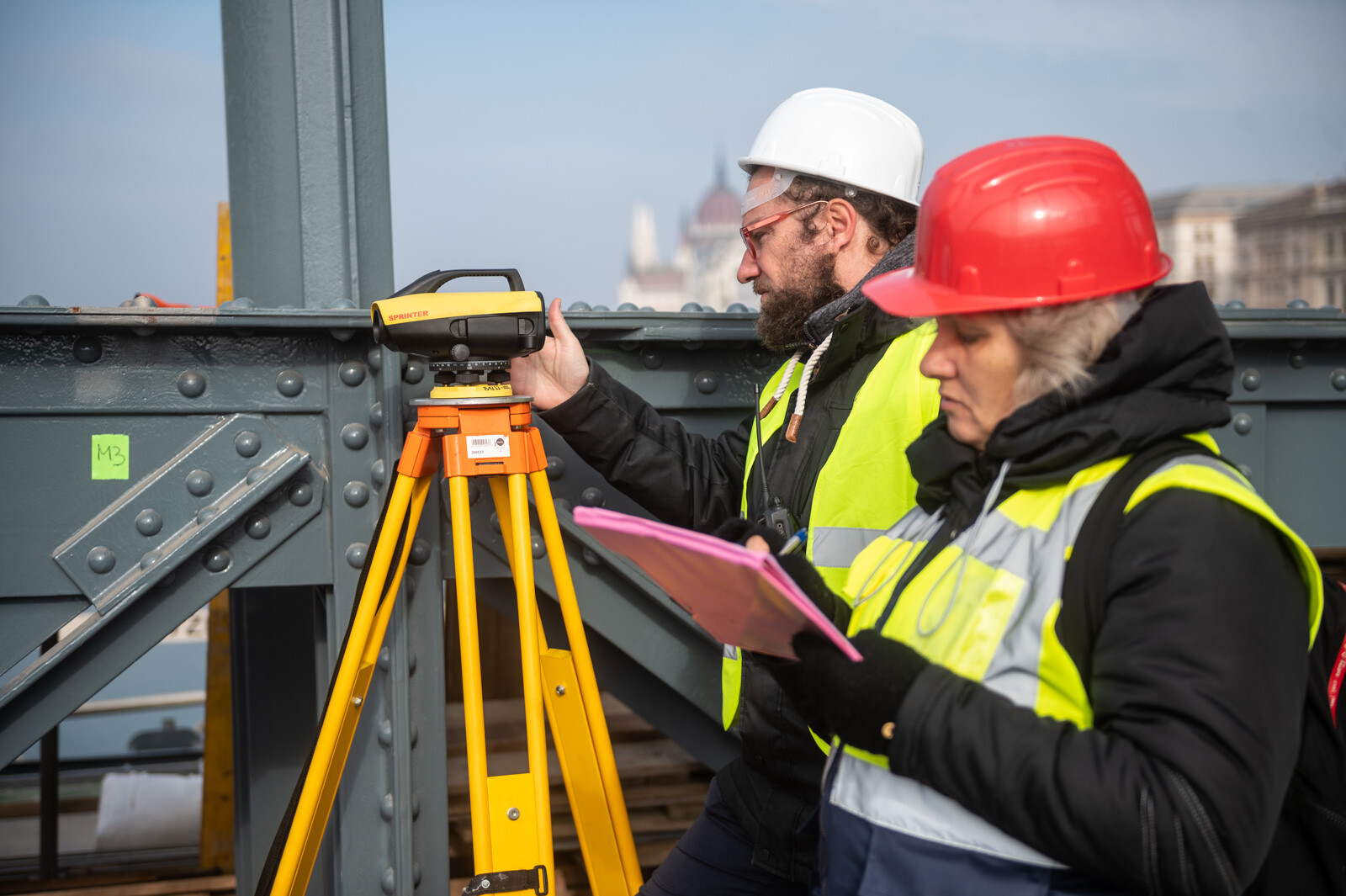 Eközben a hídról és a Duna-partról 0,5 milliméter pontosságú geodéziai műszerrel mérték a híd lehajlását. A lánckötegeken, a függesztőrudakon, a bentmaradó, régi hídszerkezeten, illetve az új acélpályán elhelyezett nyúlásmérő bélyegek segítségével azt figyelték, milyen alakváltozások jelennek meg a szerkezetben, és milyen feszültségek keletkeznek az egyes elemekben. A budai pillér tetején lévő koronasaru-teremben a koronasaru elmozdulását is monitorozták.