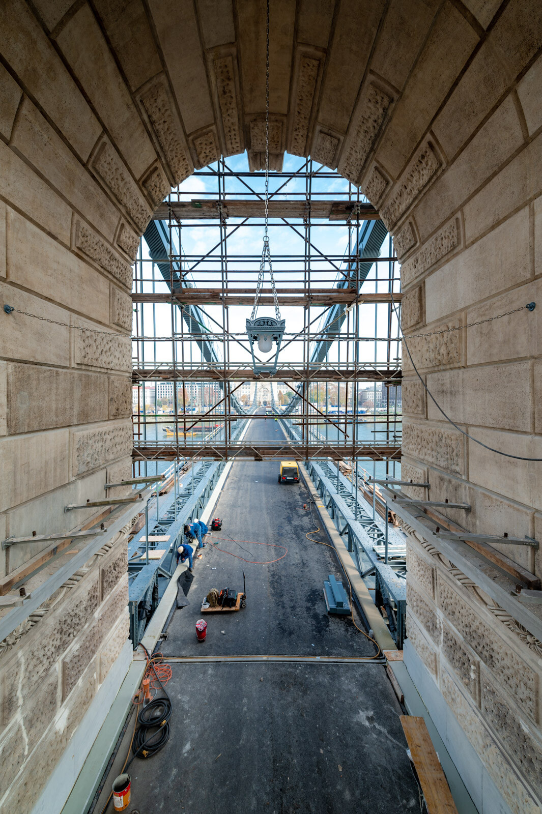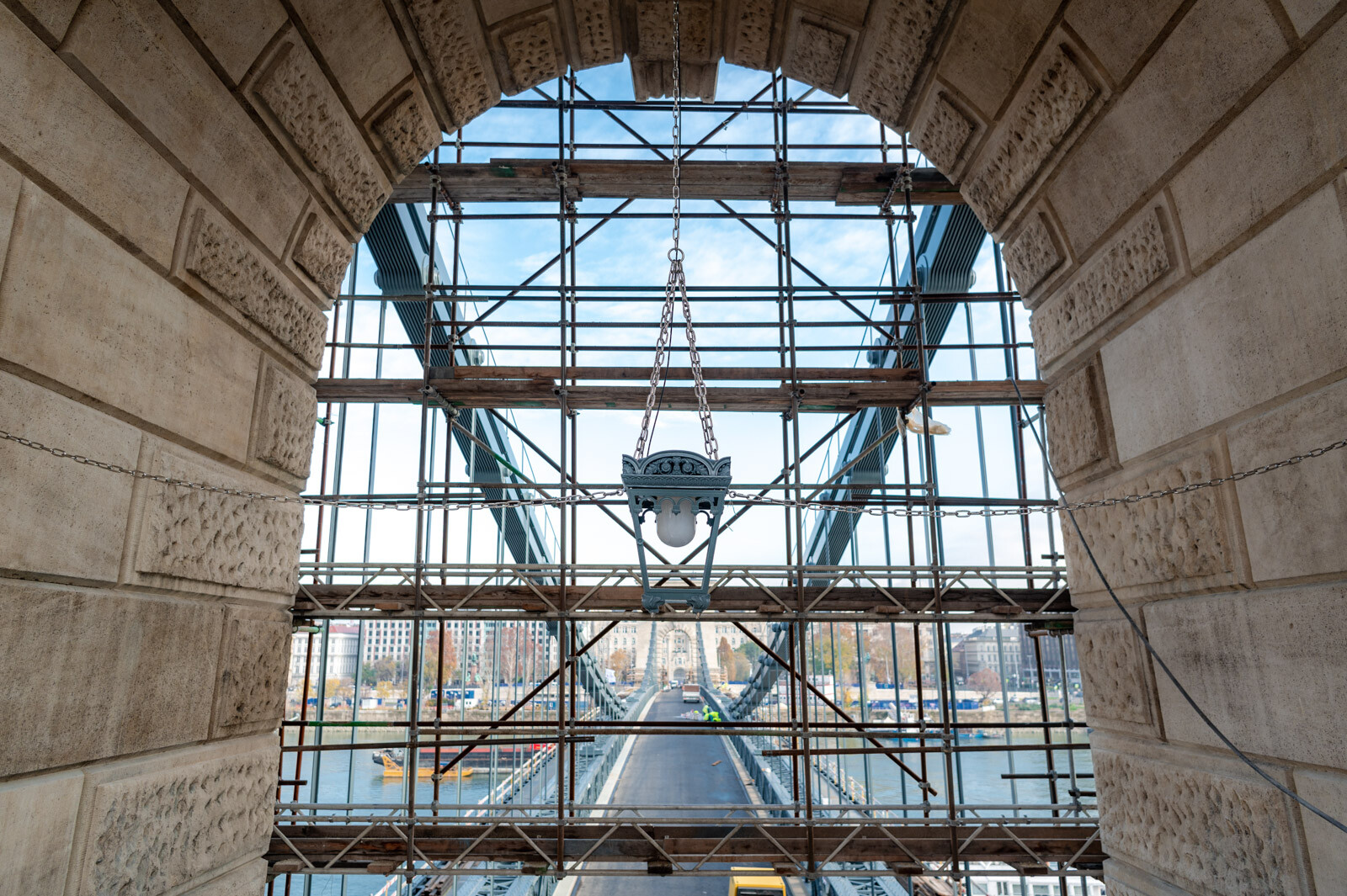 A tervek szerint december közepére a budai oldal díszes bronzkandeláberei is a helyükre kerülnek. Az első világítóoszlopokat még az átkelő tavaly júniusi teljes lezárásakor emelték le a hídfőről. A történelmi, díszes világítótesteket az elmúlt hónapokban gondos és aprólékos munkával rekonstruálták és restaurálták a szakemberek.
