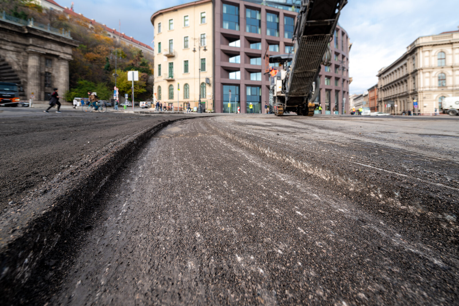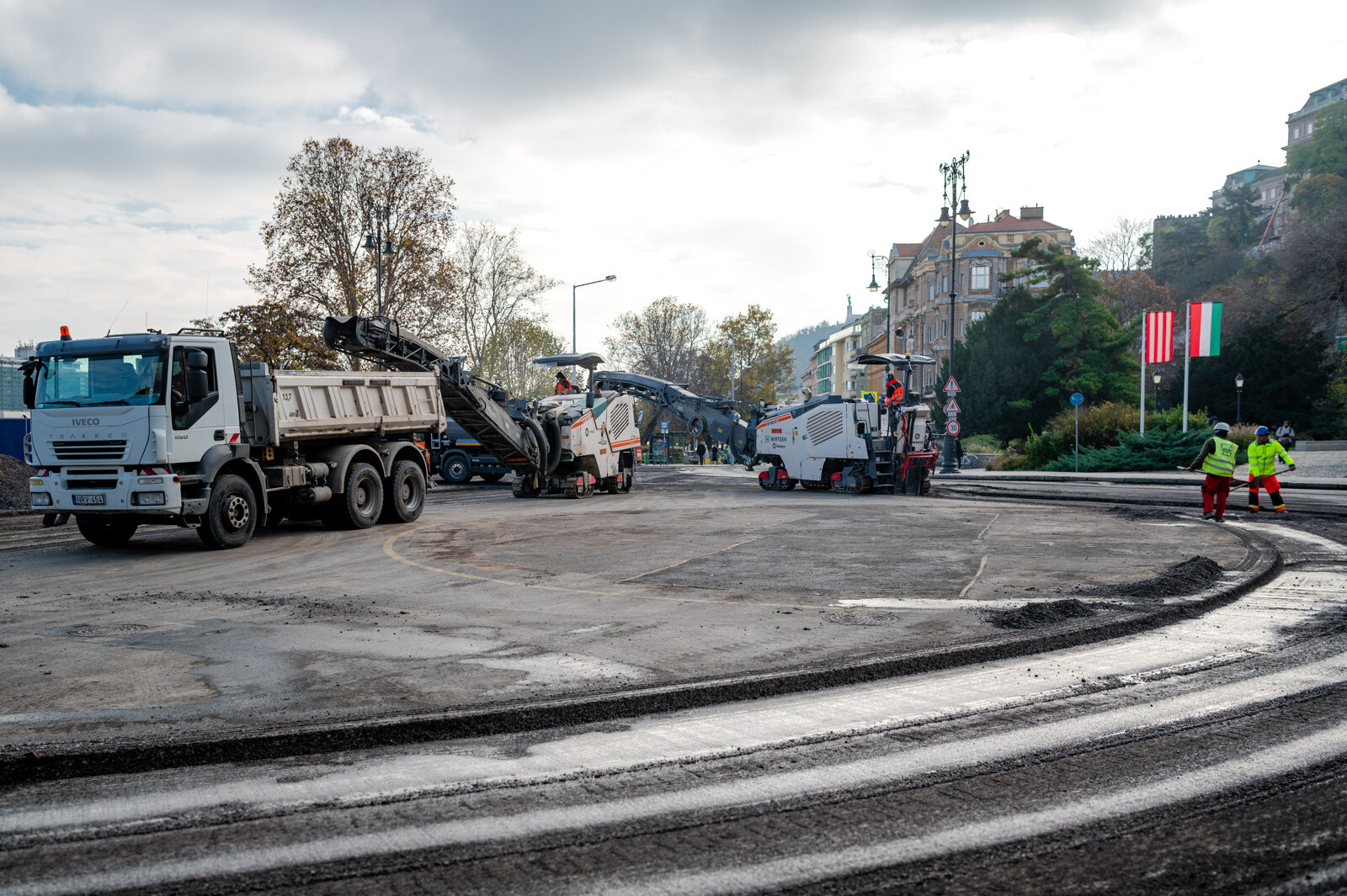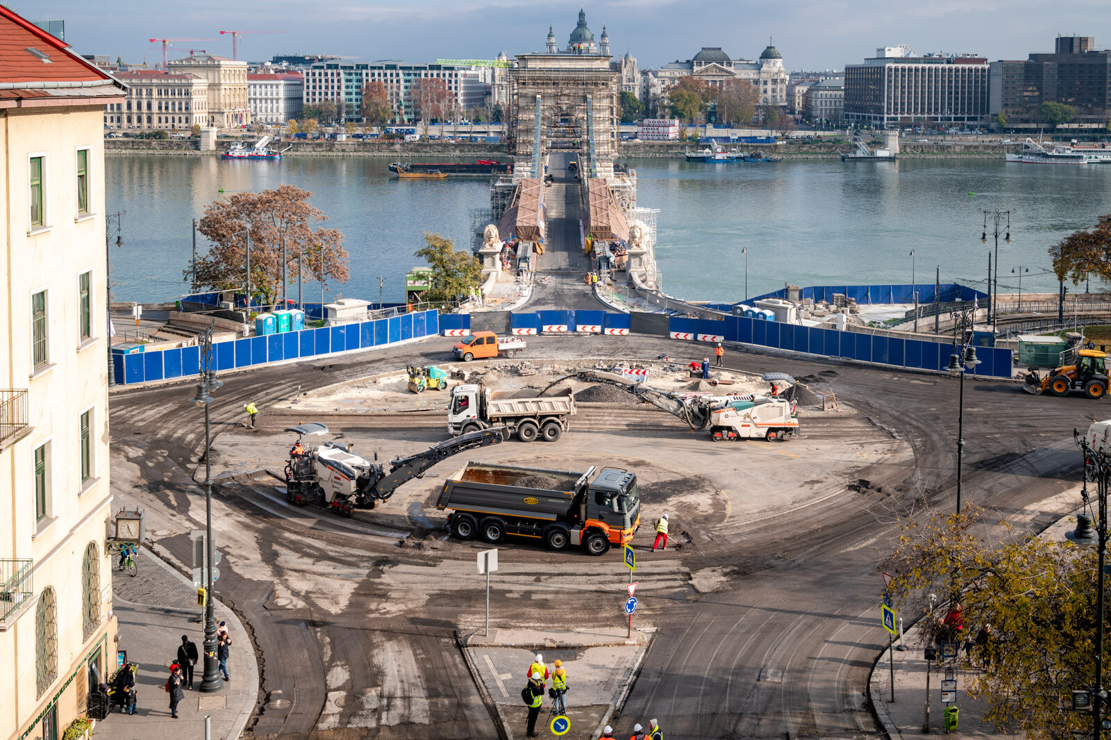 A szakemberek a november 19-20-i hétvégén felmarták a Lánchíd felújításához kapcsolódva tavaly májusban kialakított ideiglenes körforgalom aszfaltját, és helyreállították a korábbról ismert „nagy” körforgalom nyomvonalát, emellett geodéziai kitűzésekkel elkezdték a szegélyek és a szigetek visszaépítését.