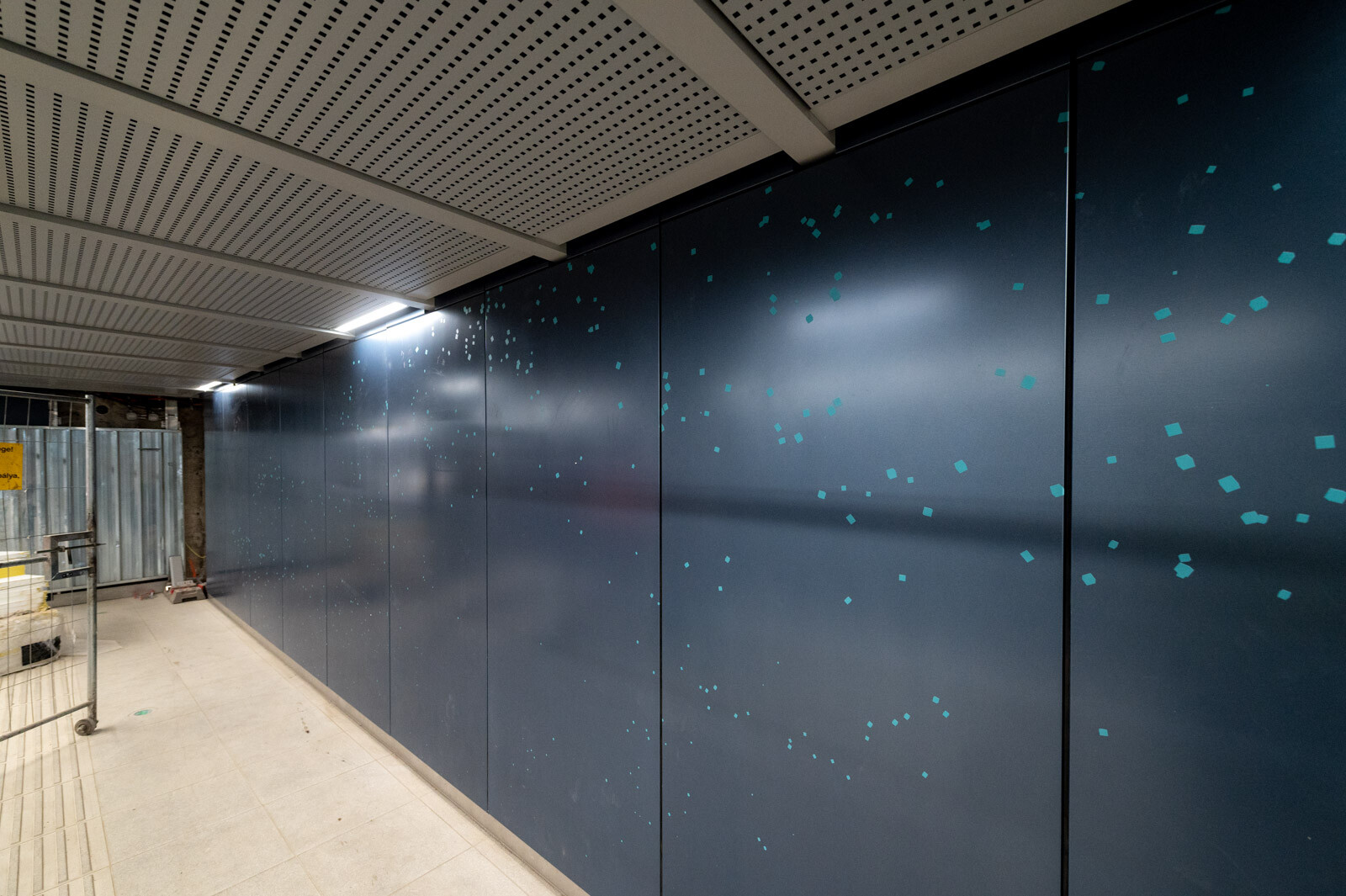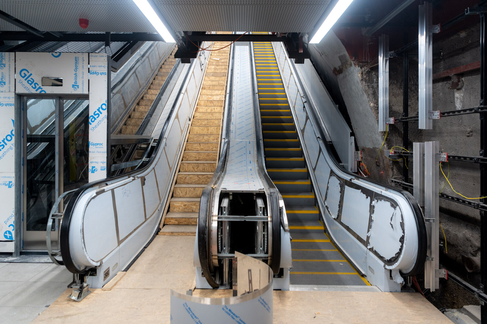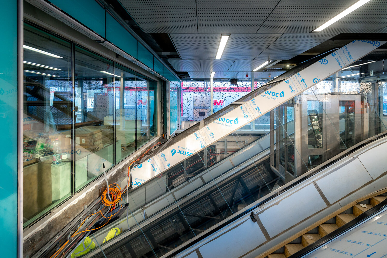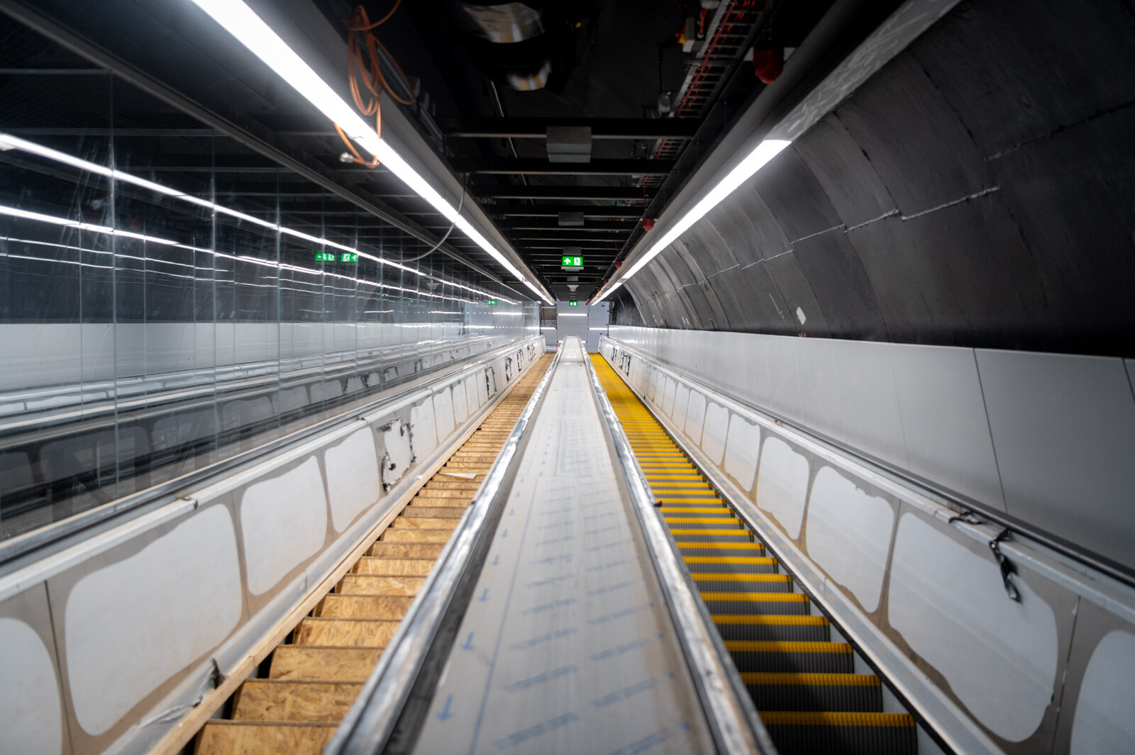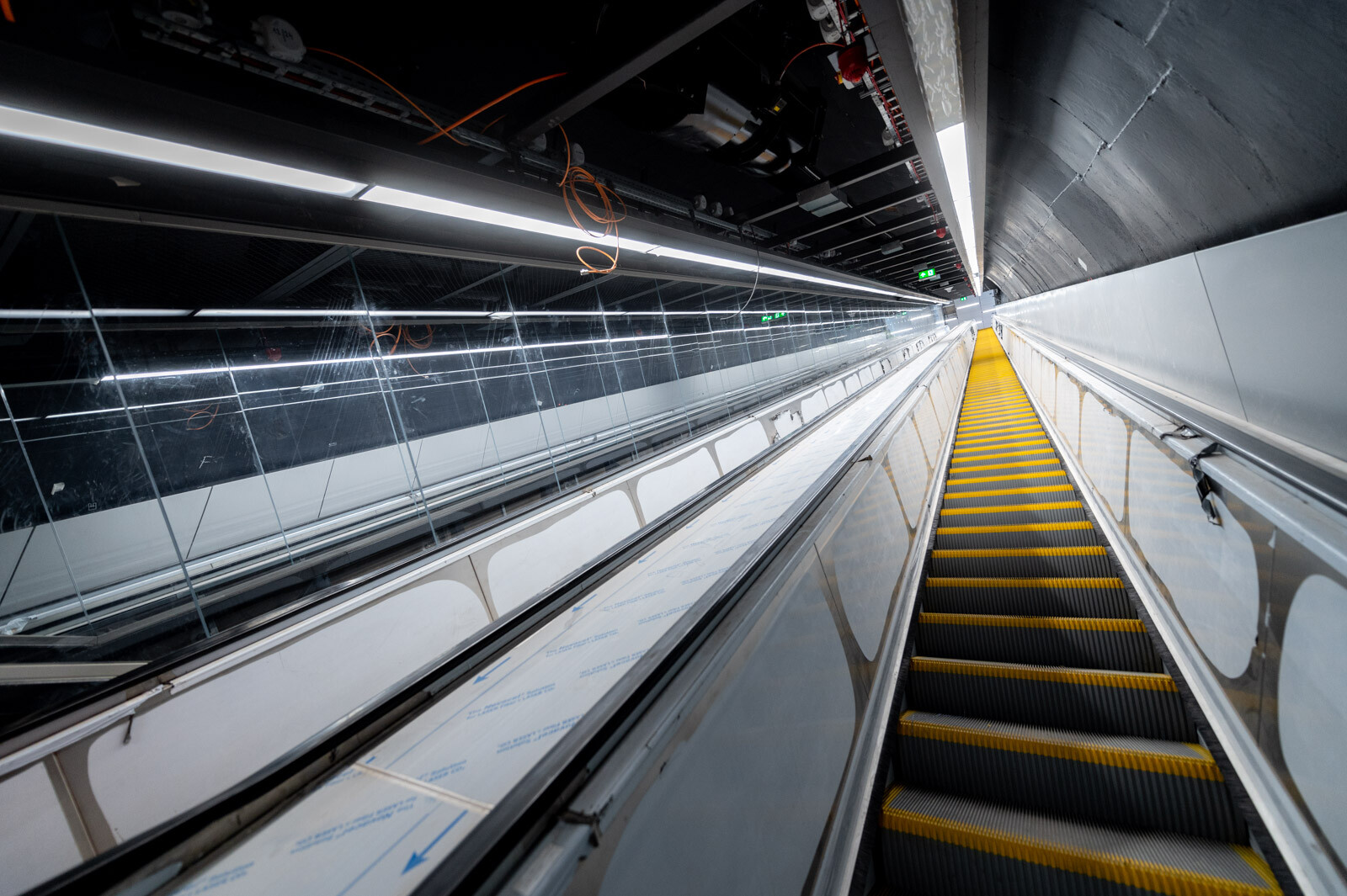 Emellett végső szerelési fázisában van a ferdelift szerkezetének és a liftkabinnak a telepítése. A ferdelift kabinját mindkét oldalról üvegfal választja el a mozgólépcsőktől.
