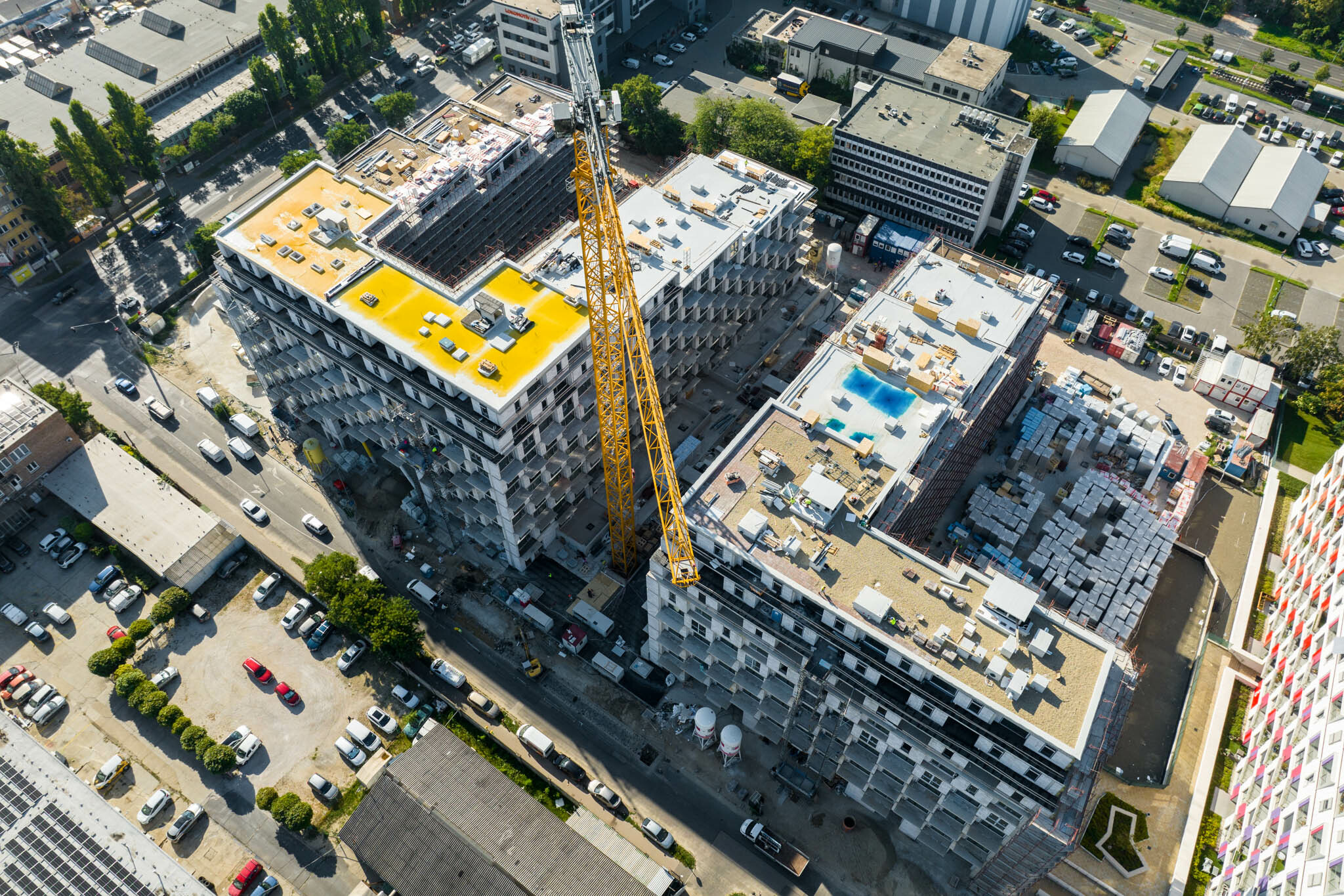 Számos előregyártott elem került az épületbe: a födémpanelek vagy az erkélyek tartószerkezetei már készen érkeztek az építkezésre, ami a Bayer Property ingatlanfejlesztési stratégiájának fontos része. 464 lakás épül itt, hatalmas segítség volt tehát az előregyártás az építkezés során.