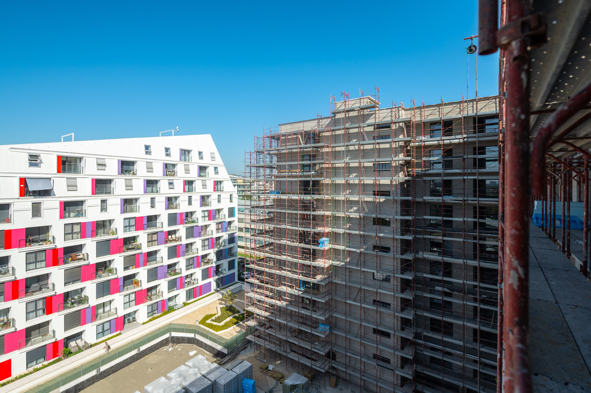 A kertben nincs autóforgalom, így valóban szabadon le lehet engedni a gyerekeket játszani, hiszen zárt, biztonságos környezet születik a kilencemeletes lakóépületek között, amelyek valódi magassága a hatodik emelettől visszatört homlokzat optikai játéka miatt alig érzékelhető. E törések az épületek minden oldalán megjelennek, így csupán hatemeletes épületeknek tűnnek, ettől pedig barátságosabb érzetet keltenek a hasonló léptékű beruházásoknál – erre erősítenek rá a homlokzaton megjelenő színek is. A visszaléptetések adta teret használták ki nagyobb teraszok beépítésére, ahol minden tetőszakasz a fölötte lévő lakás födéme, de egyik sem túlzó méretű. Törekedtek arra, hogy ne alakuljanak ki 200 négyzetméteres, óriási teraszok.
