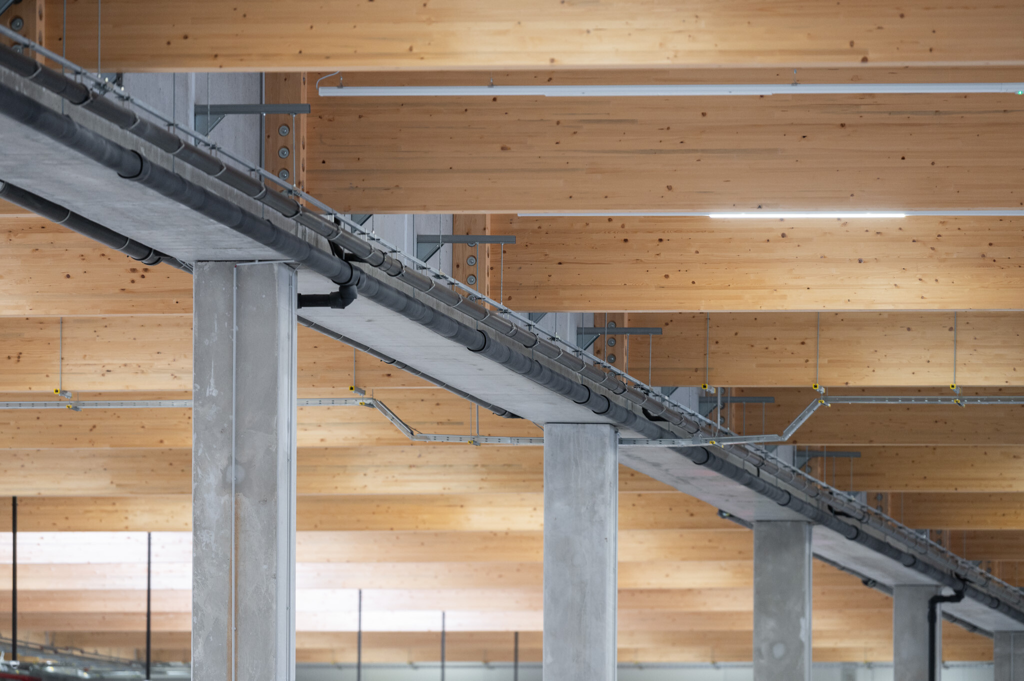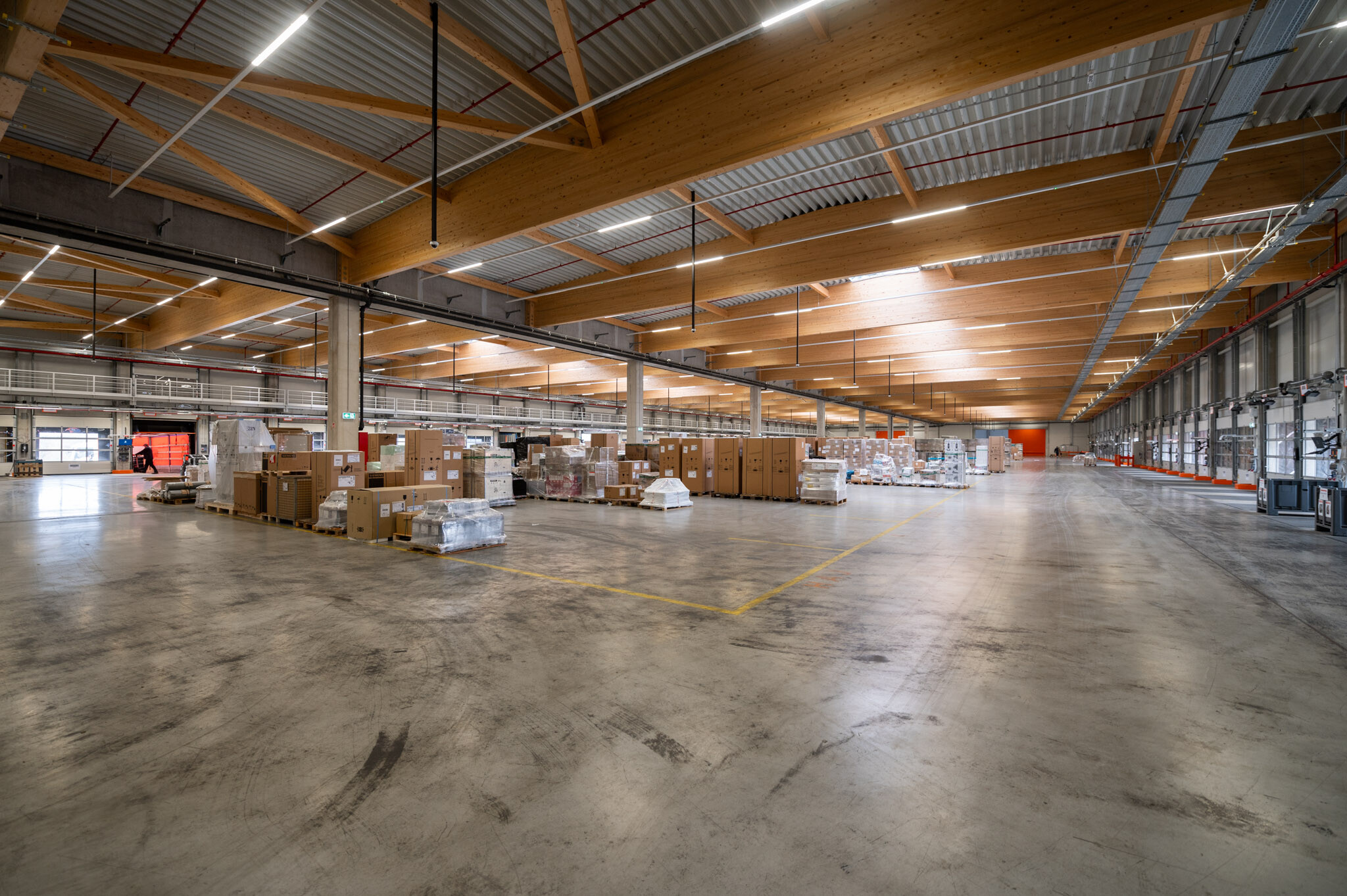 Az átadó raktárrész 9 méter magas épülete, közel 6 ezer négyzetméter alapterületű. Knoll Csaba az egész projekt legérdekesebb elemének, ennek az épületegységnek a fa tetőszerkezetét tartja, amelynek részei a 24 méter hosszú elemek Ausztriából érkeztek.