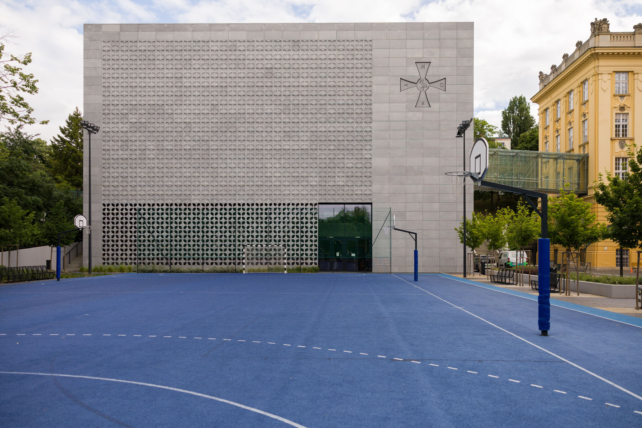 A felső szinten egy újabb sportpálya épült meg, amelyhez egy 150 főt befogadó lelátó is épült. A betonlapokkal burkolt épület homlokzatát a ciszterci címer díszíti.
