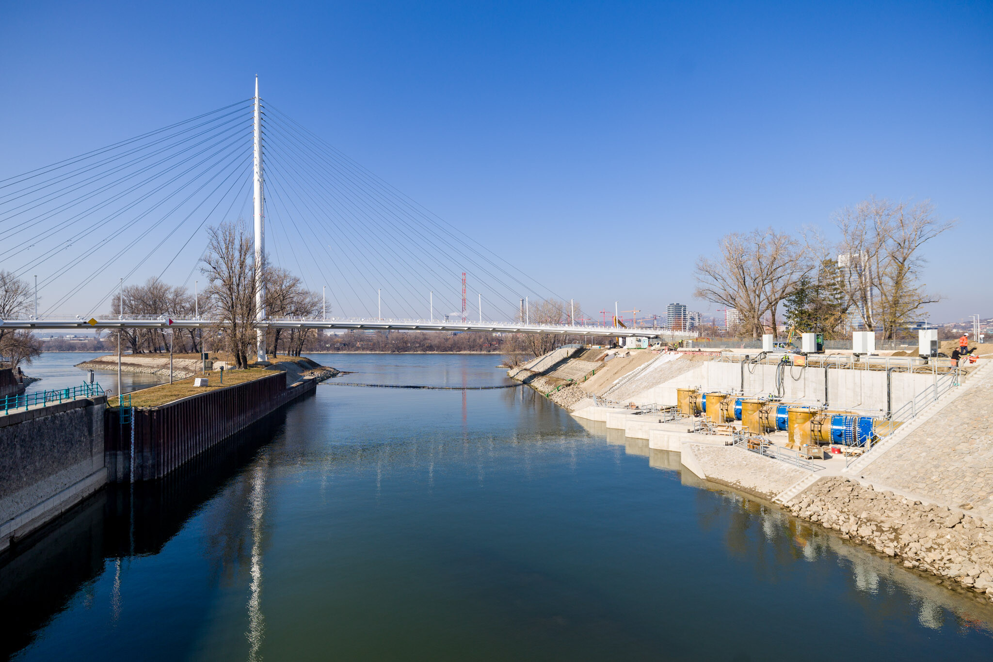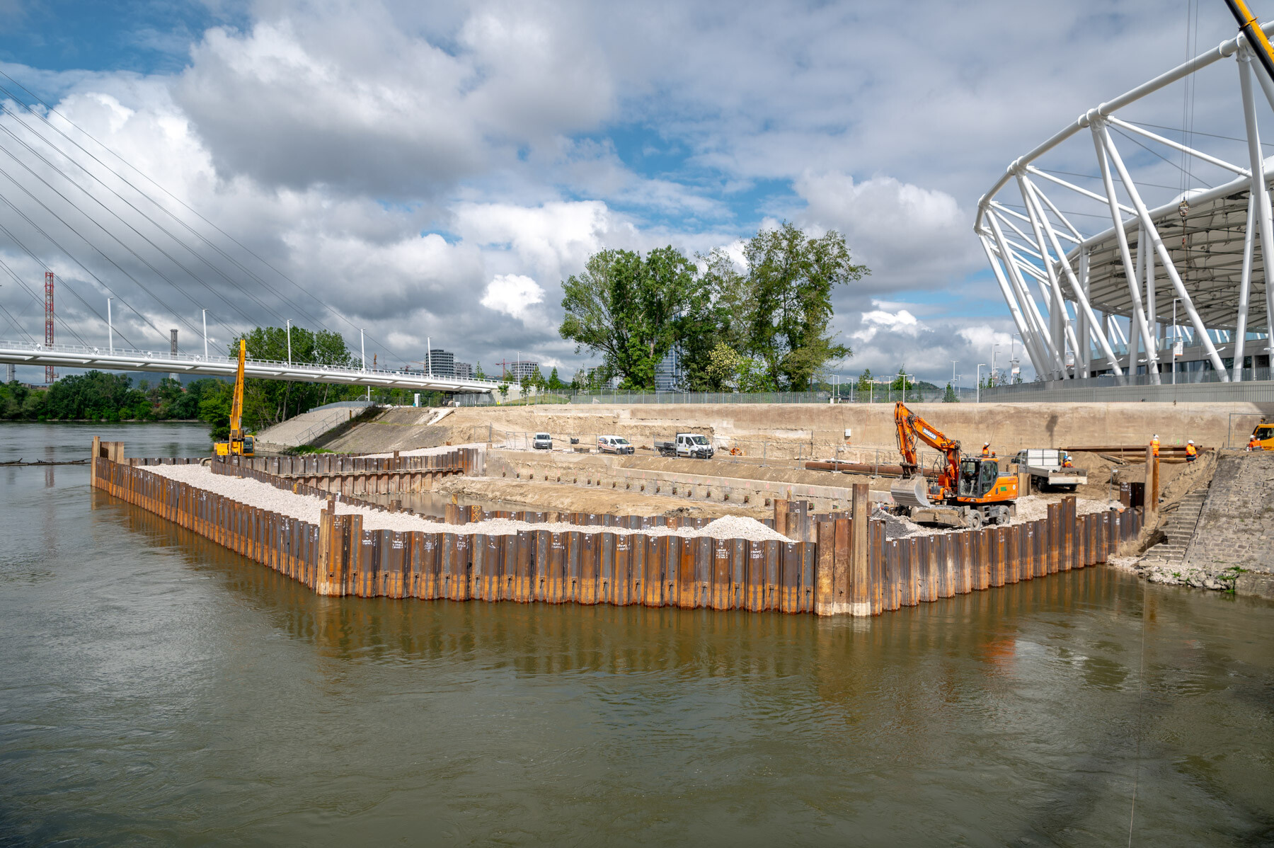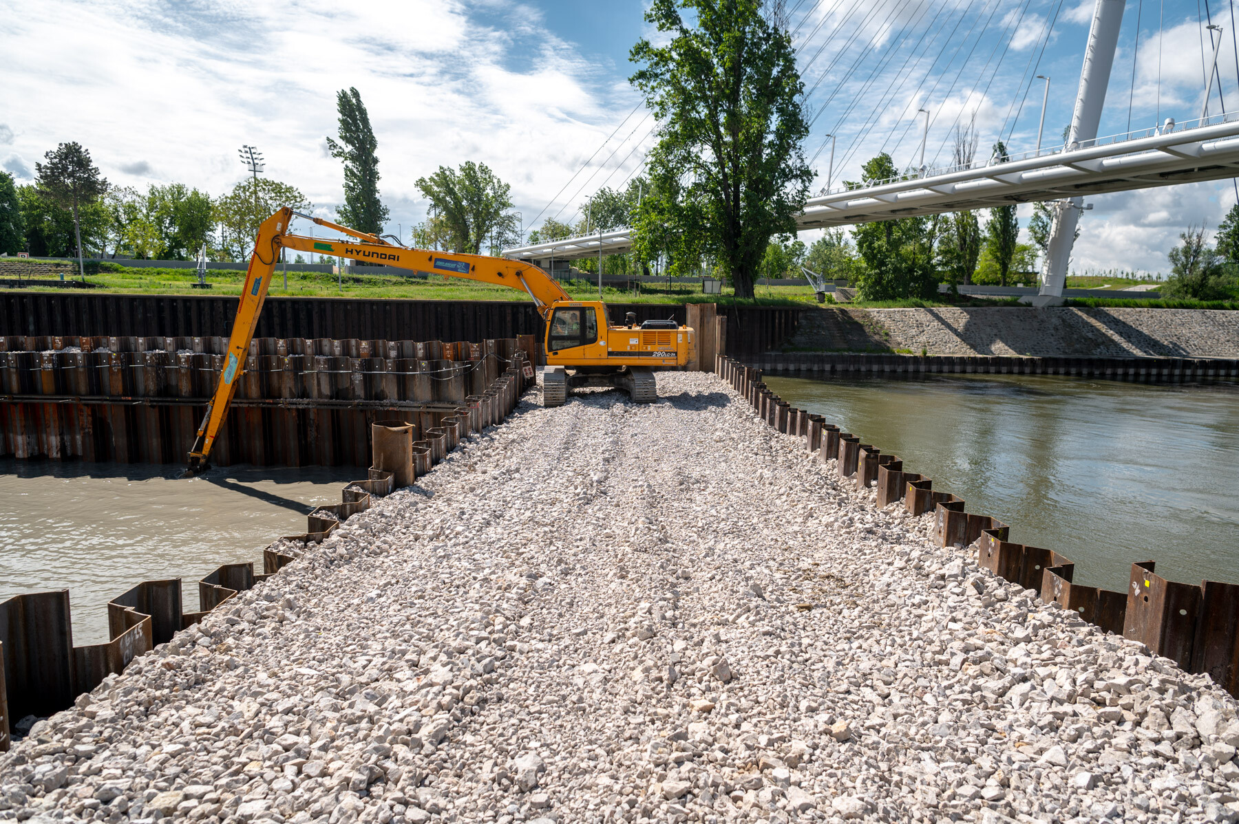 A munkaterület kialakításához a folyómeder egy részét szádlemezekkel lehatárolták. Egy 80 méter széles és 100 méter hosszú úszóbárka érkezett a mellékágba a fedélzetén egy 100 tonnás lánctalpas daruval, és egy 30 tonnás hosszúgémes kotróval, valamint a szádfalverő géplánccal.