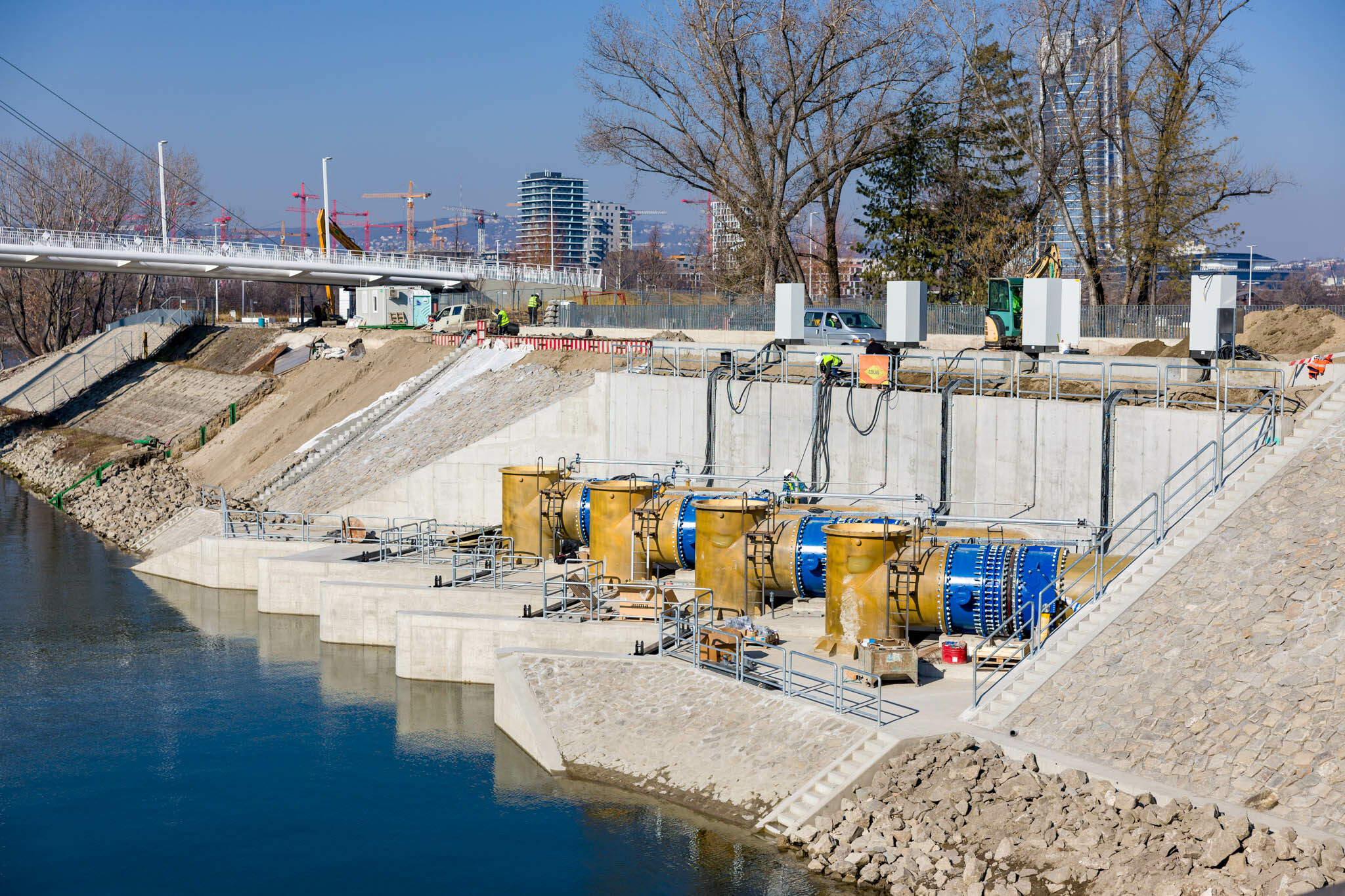 A víztelenített munkaterületről 8000 köbméter iszapot és agyagot emeltek ki. Ezután kezdték el az alaplemez és az agyagba befogó gerendák építését. Ekkor a júniusi árhullám szakította meg a munkálatokat. Mielőtt a víz elérte volna a munkaterületet kiemeltek minden munkaeszközt onnan, majd át kellett adniuk azt a Dunának. Az árhullám levonulása után kiszivattyúzták a vizet. Kialakították az előfenék betonozásához a vasszerkezetet, ami rávezeti a vizet a négy szivattyúra. Hét méter magas betonfalak épültek a mederben, erről egy korábbi cikkünkben írtunk.