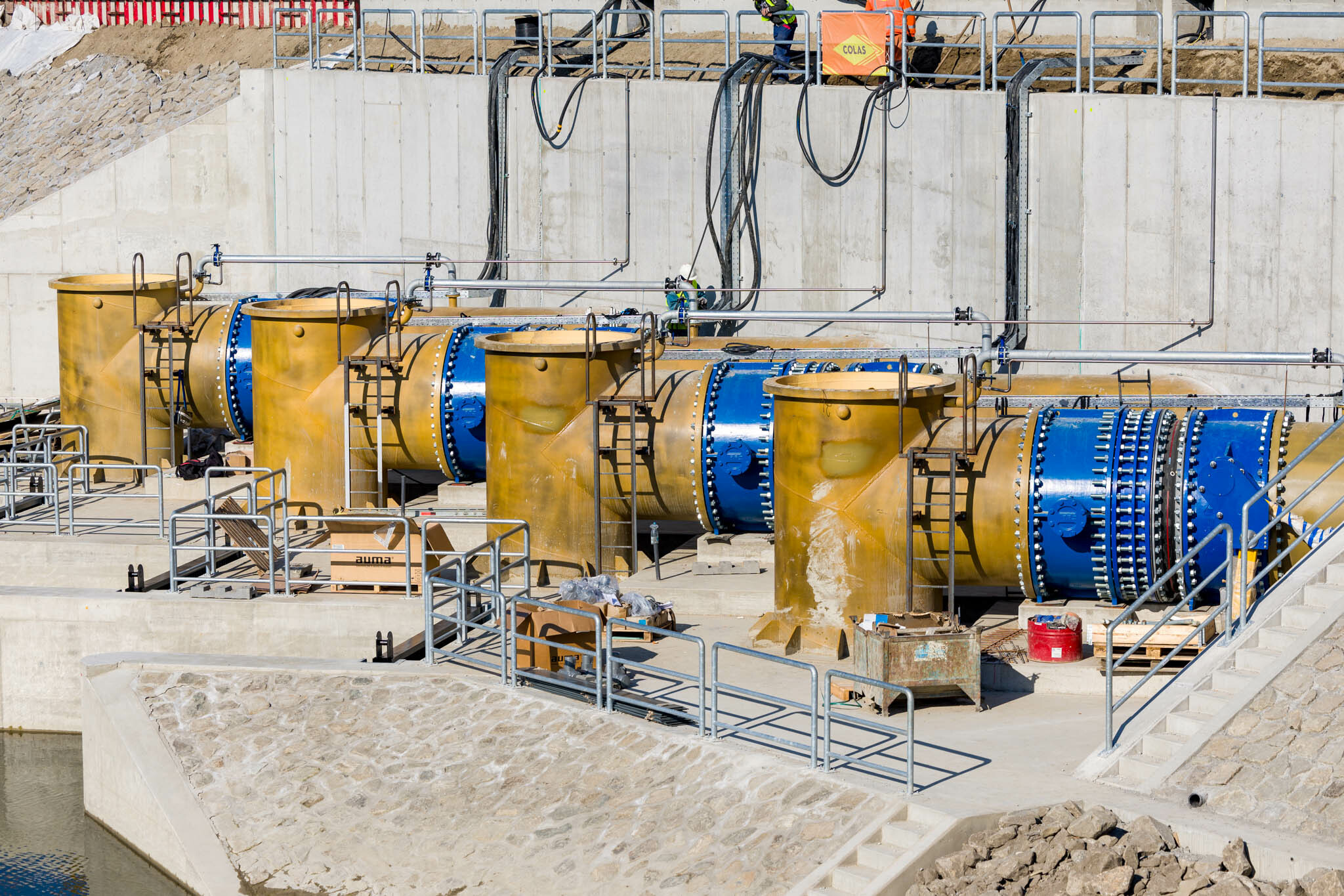 Szeptemberre elkészültek a szivattyúk patroncsöveivel. Az új telep négy szivattyúját 2 db párhuzamosan lefektett, egyenként 1,8 méter átmérőjű cső, - amelyek egy 2,4 méter átmérőjű csőbe egyesülnek- szolgálja majd ki – mondta el Dán Martin. Az acélcsövek 30mm vastagságú porcelánkeménységű felületkezelést kaptak, hogy megfeleljenek a vízügyi beruházásoknál elvárt száz éves élettartamnak. A kivitelezés ezen szakaszát egy újabb árhullám is terhelte, a mederben egy toronydaru segítette a szivattyútelep építését, amelyet lesúlyoztak az áradás idejére. Kéthetes iszaptalanítás után emelték be a szivattyúkat a helyükre.