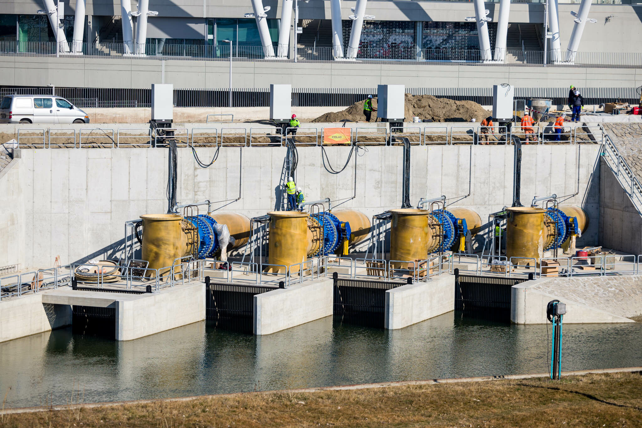 A kivitelezés két nagy részre osztható, amelynek első része 2022 év elején kezdődött – mondta el Dán Martin, a Colas Alterra Zrt. projektvezető mérnöke. Az első részben az árvízvédelmi résfal építésével és a nyomóoldali csövek fektetésével, valamint a műtárgy megépítésével készültek el. A résfalon átvezetett két csövet és a déli és az északi kamrákat kialakításuk után lezárták, addig míg megépültek a projekt szívóoldali elemei. Az első szakasz kivitelezésével a 2023 szeptemberében megrendezett atlétikai világbajnokságig el kellett készülni, mivel a munkaterület a stadion szomszédságában van és a kivitelezés nem zavarhatta a világbajnokság lebonyolítását.