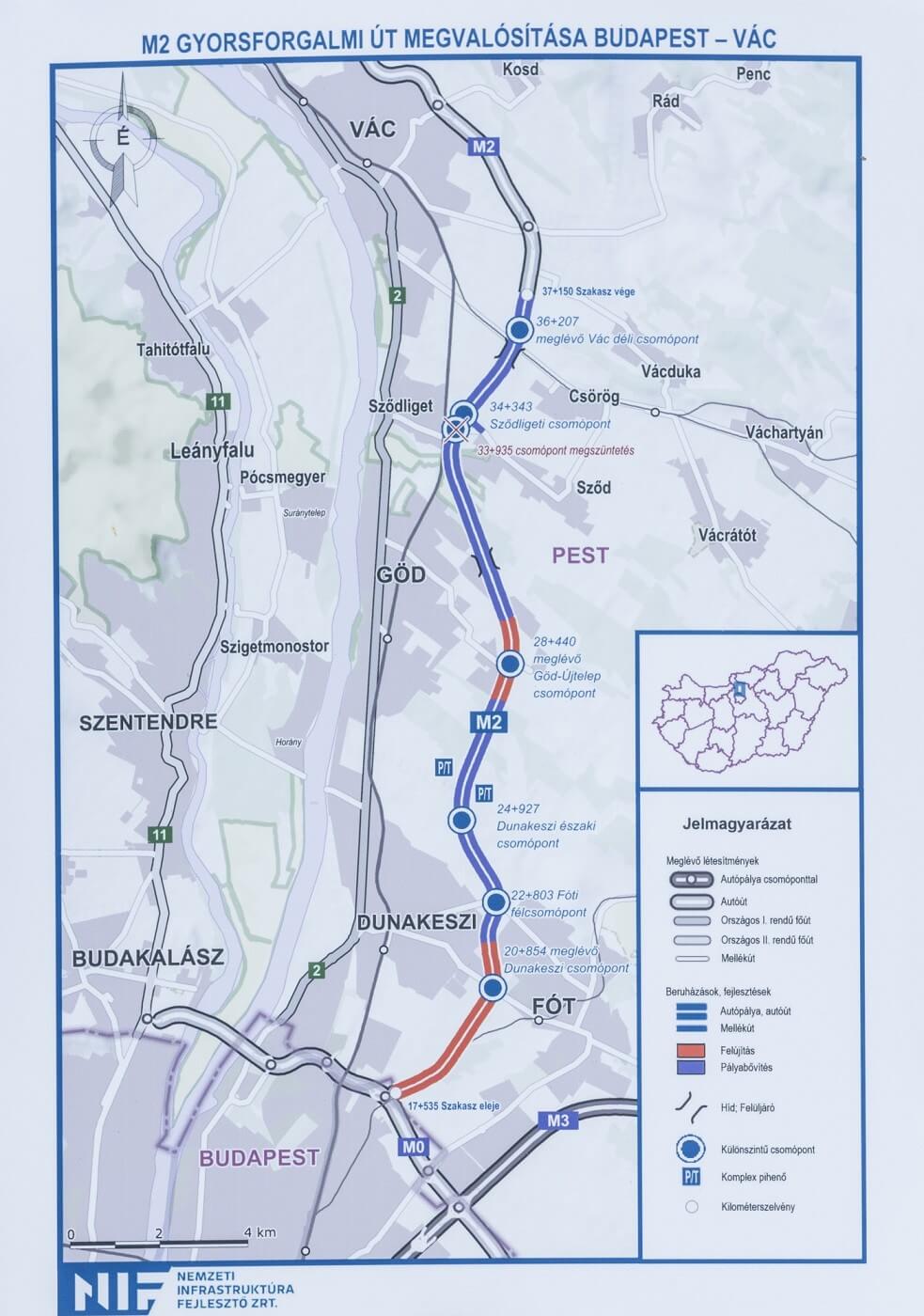 Pénteken délben elhelyezték az M2-es út Budapest és Vác közötti fejlesztésének alapkövét. A Strabag Építő Kft. és a Strabag AG konzorciuma által megvalósuló beruházásban az M0-ás és a Vác déli csomópontja közötti 19,6 kilométeres szakasz újul meg, illetve négysávosodik nettó 32,9 milliárd forintos értéken. A projekt uniós és hazai forrás felhasználásával valósul meg, eredményeként tovább csökken az átmenő forgalom miatti teher a 2-es főút mentén található településeken: Dunakeszi, Göd, Sződliget és Vác útjain.