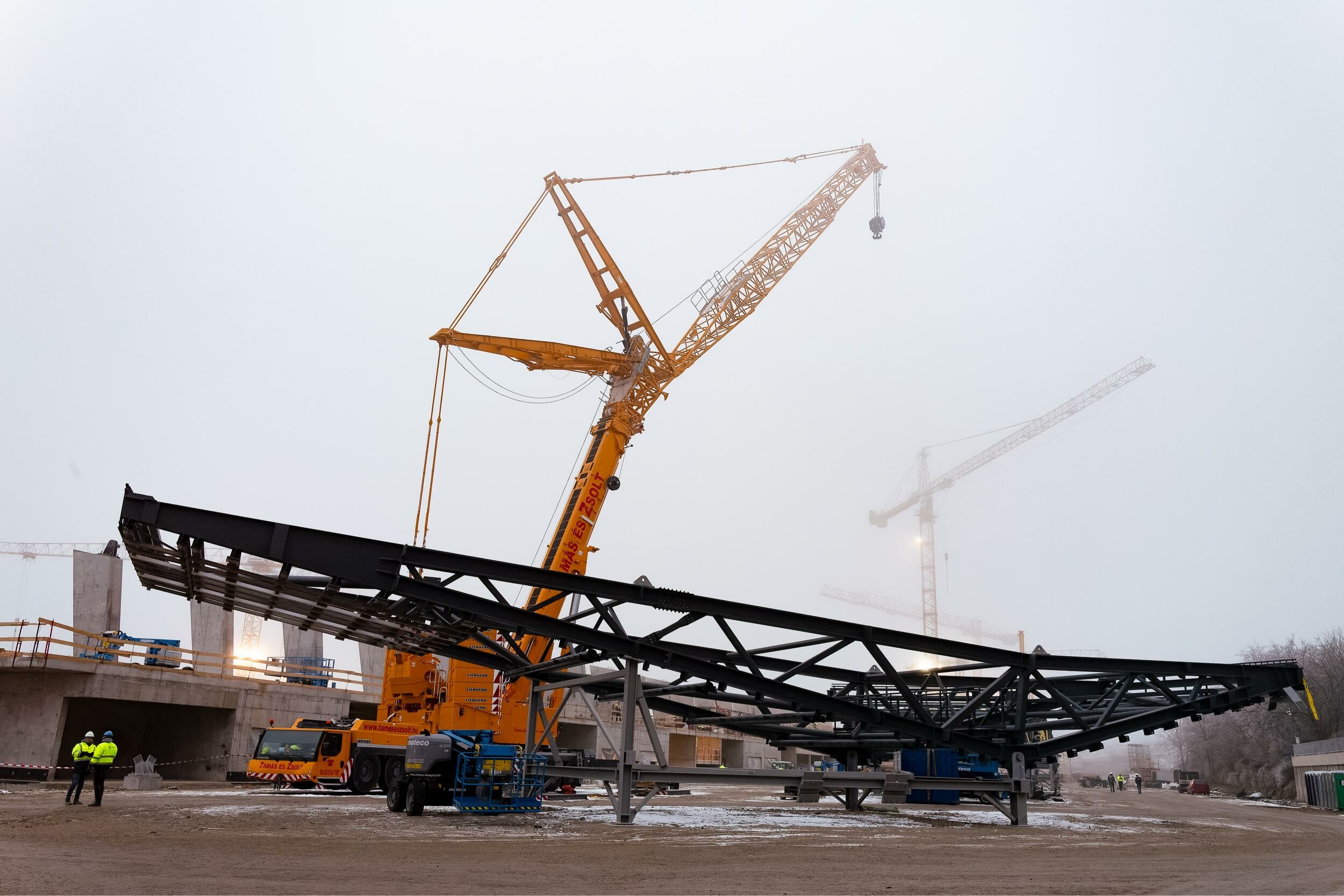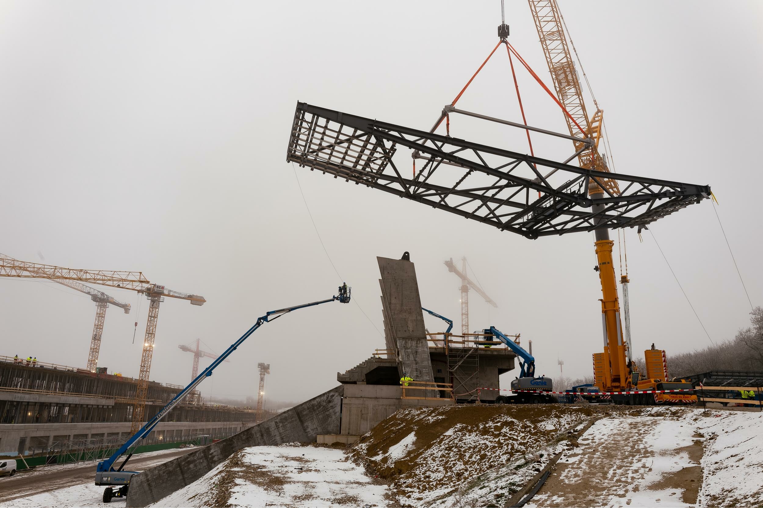 Azt is megtudtuk, hogy a tetőszerkezet kétféle elemből áll: 13 db, egyenként 53,9 tonna súlyú dupla főtartóból (ilyen volt az első beemelt elem), és 8 db 19,1 tonnás szimpla főtartóból.